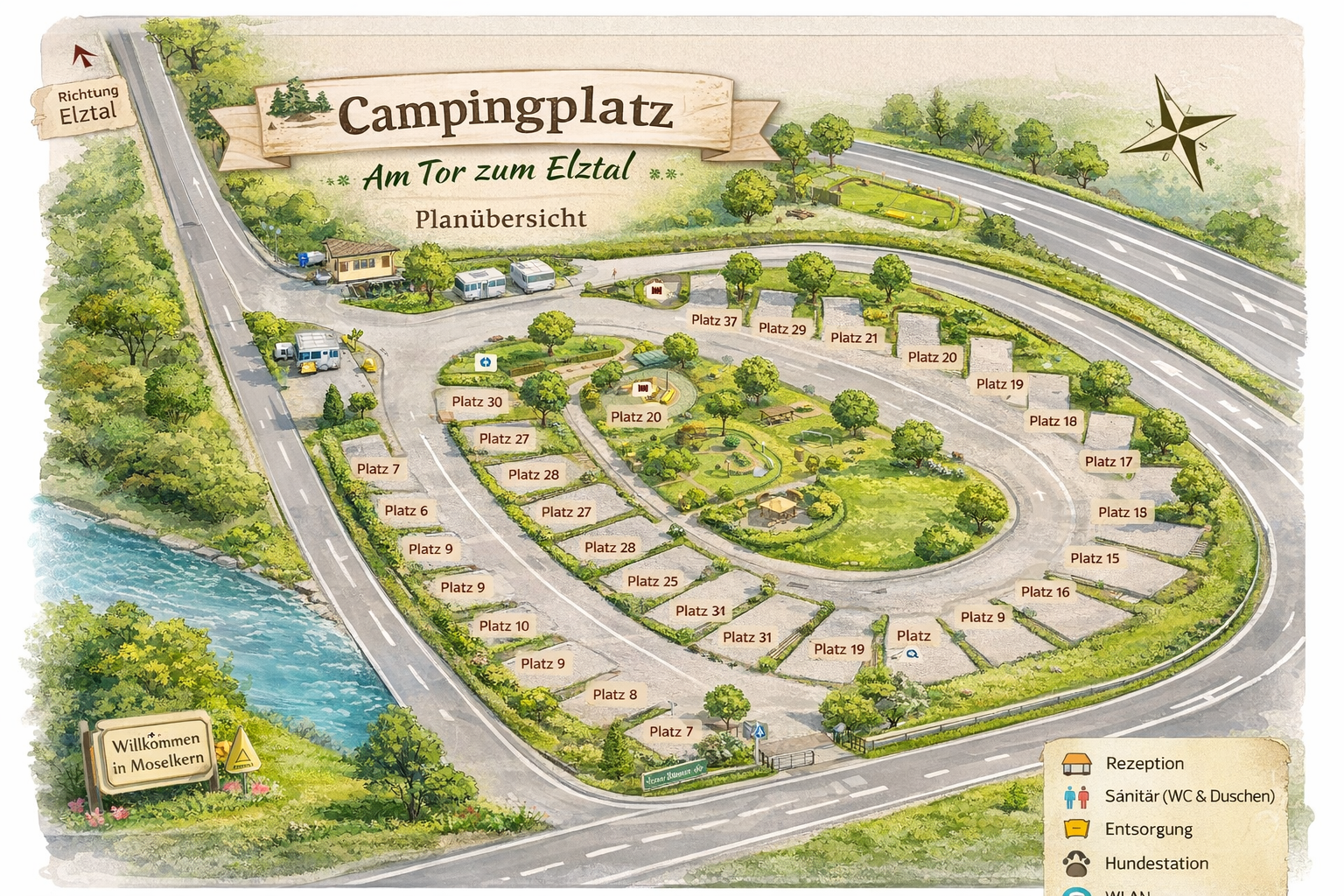 Der neu erbaute Campingplatz direkt an der Mosel, unmittelbar vor dem Elztal, verbindet moderne Ausstattung mit einer besonders attraktiven Lage. Als Tor zum Elztal bietet er mit vielen neuen Stellplätzen, umfassenden Erneuerungen und einem zeitgemäßen Gesamtbild beste Bedingungen für erholsame Urlaubstage in Moselkern. Hier treffen Komfort, Natur und die besondere Atmosphäre der Region aufeinander.