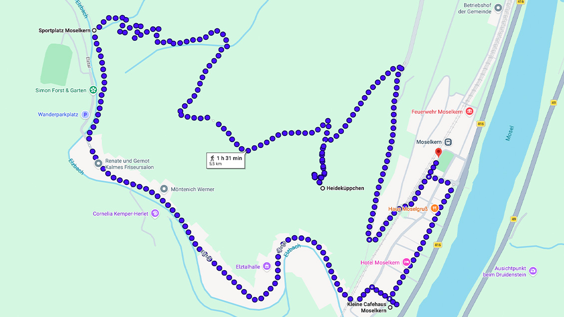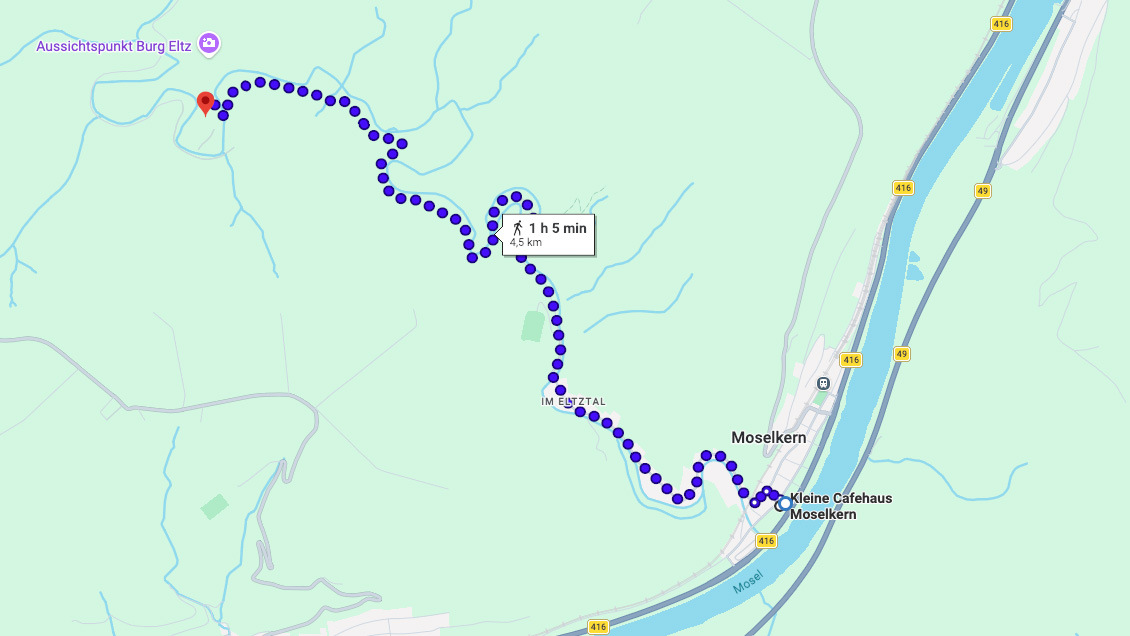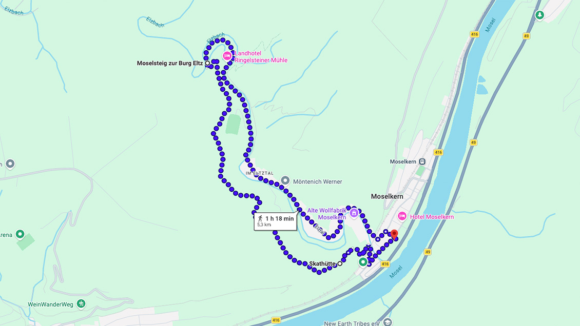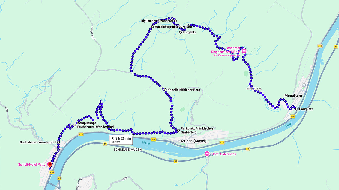 Startpunkt ist Moselkern. Von hier aus verläuft der Weg über die Ringelsteiner Mühle zur Burg Eltz, weiter in Richtung Müden und schließlich nach Treis Karden. Unterwegs führt die Strecke durch wilden Buchsbaumbestand und bietet immer wieder schöne Ausblicke. Zu den besonderen Höhepunkten zählen der Aussichtspunkt Kompeskopf sowie die Burg Eltz, die zu den bekanntesten Wahrzeichen deutscher Geschichte gehört. In Treis Karden erwartet Sie zudem der historische Stiftsbezirk mit der Stiftskirche St. Castor.